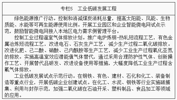 控制工业过程温室气体排放。以减少工业过程二氧化碳、氧化亚氮、氢氟碳化物、全氟化碳、六氟化硫等温室气体排放为目标,以水泥、钢铁、石灰、电石、己二酸、硝酸、化肥、制冷剂生产等为重点,控制工业过程温室气体排放。开展水泥生产原料替代,利用工业固体废物等非碳酸盐原料生产水泥,减少生产过程二氧化碳排放。开展高碳产品替代,引导使用新型低碳水泥替代传统水泥、新型钢铁材料或可再生材料替代传统钢材、有机肥或缓释肥替代传统化肥,减少高碳排放产品消费。
