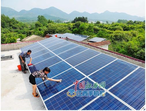 7月13日,江西省新余市分宜县洞村乡省级贫困村——程家坊村,两名村民在擦拭房顶上的光伏设备。该村光伏扶贫发电站装机容量为39.78千瓦时,于日前正式并网发电,预计年发电量达42189度,年收益达4.9万元。