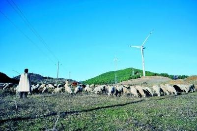 凉山州会东县拉马风电场外,彝族群众正在放羊。该项目年发电量将达到22452.6万千瓦时,每年可节约标煤近7万吨。