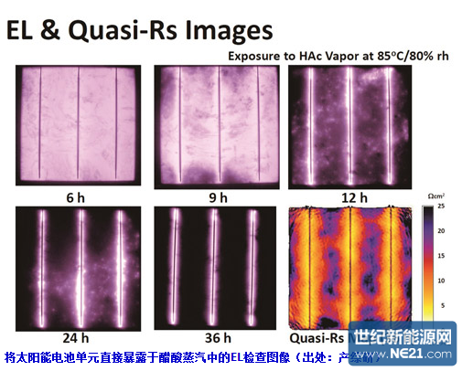 产综研称,将太阳能电池单元直接暴露于醋酸蒸汽中,则很短时间内就可看到与在高温高压环境下模块上所观测到的相同现象。劣化现象的发生速度约为在模块上实施试验的原方法的70倍。