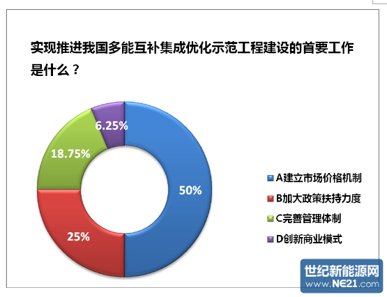 为加深对意见重要意义的理解,日前,记者通过微话题征集活动,发布调查问卷,进行数据调查。(结果如下图所示)查结果显示,有50%的受访人群认为,实现推进我国多能互补集成优化示范工程建设的首要工作是建立市场价格机制。另外,25%的受访人群认为,首要工作是加大政策扶持力度,18.75%的受访者认为,完善管理体制是推进我国多能互补集成优化示范工程建设的首要工作,有6.25%的受访者认为首要工作是创新商业模式。