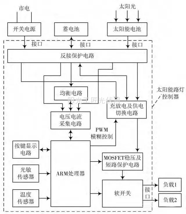 数据采集显示控制部分包括控制按键、LED显示电路,电压电流采集、温度采集,感光采集和均衡电路。控制按键包括测试按键、菜单选择键和参数选择键。测试按键可使控制器进入测试状态;菜单选择键用来选择工作模式,每按一下菜单选择按键,模式值将会变换一次,同时也会显示该模式下的对应参数,此时,按下参数选择按键则可设置该模式下的运行参数;系统的运行模式和参数等重要数据均保存在芯片内部,掉电后不丢失,使调节更加方便,系统工作更可靠。LED显示电路包括5个发光二极管的状态显示和2个数码管的运行参数显示,5个LED发光二极管用来显示太阳能电池、蓄电池、市电、负载1、负载2的工作状态,2个数码管在进行参数设置时分别显示模式和该模式下的参数,在没有进行参数设置时显示温度。电压采集、电流采集、温度采集、感光采集分别完成对蓄电池和太阳能电池电压、放电电流、温度状态、光照情况的采集,并将这些信号供ARM处理器运算处理,电压电流采集电路受ARM处理器的控制,从而控制均衡电路是否工作。