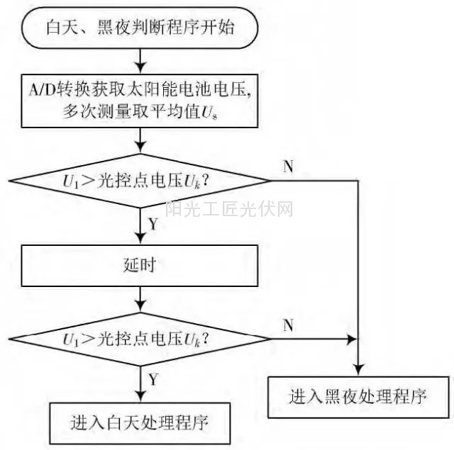 本控制器在完成自检及初始化程序后,读取各种设定的参数,如工作模式、蓄电池类型等,然后进入白天、黑夜判断程序,根据所判断的情况分别进入白天处理程序或黑夜处理程序。白天黑夜的判断可以通过读取太阳能电池两端的电压来判断,也可以通过采集控制器预留的光敏传感器接口信号来判断,根据太阳能电池的电压来判断的白天、黑夜判断程序如图3所示。