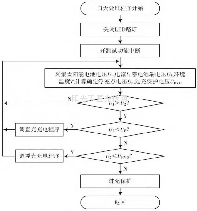 白天处理程序如图4所示,进入白天处理程序后首先关闭LED路灯并打开测试按键所对应的中断,然后采集太阳能电池的电压U1,蓄电池的电压U2,环境温度T,根据环境温度T及温度补偿系数(铅酸电池-5mV/℃,锂电池-4mV/℃,这一系数也可在程序中调整)计算确定蓄电池浮充点电压Uf,过充保护电压Uhvd,并根据采集到的U1,U2之间的大小关系决定是否执行充电程序,进入充电状态后,又根据U2的大小决定是直充、浮充、还是过充保护。