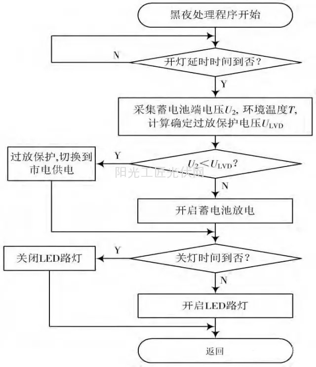 黑夜处理程序如图5所示。进入黑夜处理程序后,首先判断开灯延时时间是否到了,如果没有到,则一直等到开灯延时时间到,开灯延时时间到了,则采集蓄电池的电压U2、环境温度T,根据环境温度T及温度补偿系数计算确定蓄电池过放保护电压Ulvd,并根据采集到的U2决定进入过放保护、切换至市电供电或开启蓄电池放电以开启LED路灯,LED路灯开启后又要判断关灯时间到否,若关灯时间到了,则关闭LED路灯,两路LED路灯可以实现单独控制。
