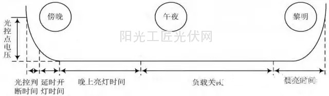 控制器在进行软件程序设计时也可增加两路负载的双时段控制功能,双时段控制是指两路负载的晚上亮灯时间和早晨亮灯时间均可设置,设置为双时段功能后,负载晚上亮灯一段时间后关闭,天亮之前再次亮灯,等到白天时再关闭,并且亮灯时间可调。双时段控制的示意图如图6所示,控制器通过监测光控点可以实现纯光控,也可以实现光控和双时段定时配合控制。光控点是指晚上亮灯时太阳能电池板的电压值,用户可以根据实际环境调整光控开启电压,比如晚上太阳能电池板有其他光线干扰而开不了灯时,可调高此值,滤除杂光干扰,但开灯时间可能提前。光控判断时间指电池板电压达到光控点时需要判断的时间,时间越长滤波效果越好,调小此值可以达到提前开灯的目的,但容易受外界杂光干扰。延时开灯指晚上延时一定时间再开灯,调节此时间,可以达到推迟开灯的目的。