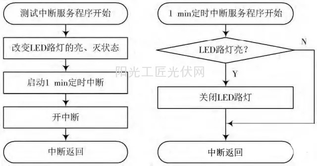 控制器还设有测试功能,测试按键采用中断模式,当有测试按键按下时,进入测试状态中断服务程序。白天时,按下控制器上的测试按键,可以直接打开LED路灯负载,再次按下则关闭负载。打开后没有再按键关闭负载,则1min后自动关闭,方便现场施工测试使用。测试功能的软件流程如图7所示。