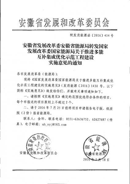 近日,安徽省发改委转发国家发改委国家能源局《关于推进多能互补集成优化示范工程建设的实施意见》,要求安徽省各市确定优选符合的项目,每个市报送的项目原则上不超过2个。