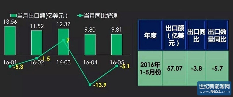2016年1-5月份光伏产品出口额57.07亿美元,同比下降3.8%,出口数量同比下降5.7%。除3月份外略有增长外,其他各月同比均有不同程度下降。