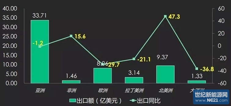 亚洲为我国光伏产品出口的最主要市场,2015年出口88.62亿美元,占比60.4%,同比增长12.8个百分点。出口欧洲和北美洲分别为22.42亿美元和18.49亿美元,占比为15.3%和12.6%。