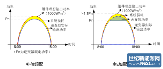 上图所示,在主动超配的情况下,由于受到逆变器额定功率的影响,在组件实际功率高于逆变器额定功率的时段内,系统将以逆变器额定功率工作;在组件实际功率小于逆变器额定功率的时段内,系统将以组件实际功率工作。