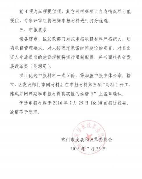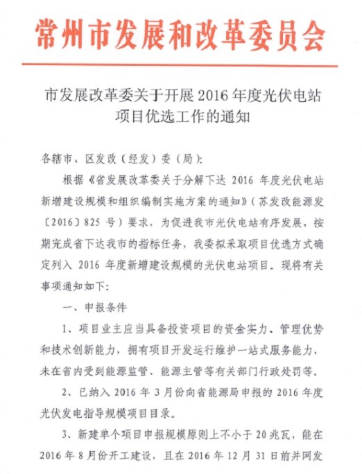 附件:常州市发展改革委关于开展2016年度光伏电站项目优选工作的通知