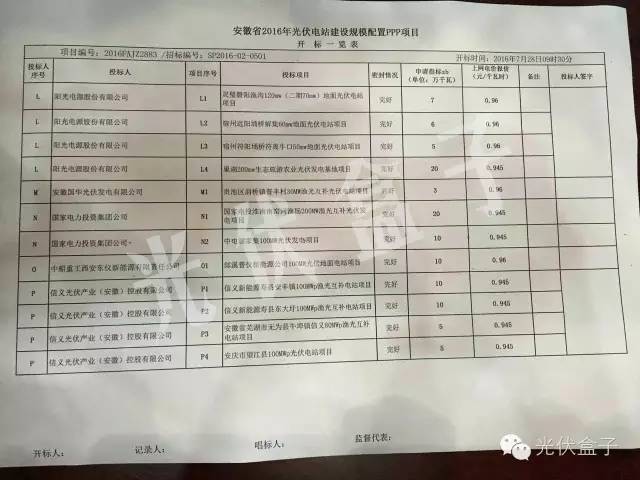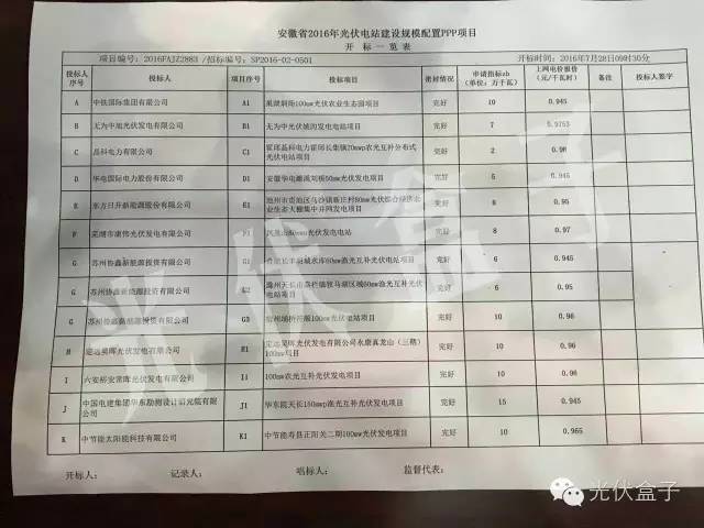 此招标于今日即7月28日9:30开标,光伏盒子小编拿到了第一手的资料《开标一览表》。从此表看,阳光电源、苏州协鑫,晶科、中国电建、中节能、国电投、中船重工、东方日升、信义光伏等16家公司都参加了此次招标,共25个项目,申请指标竟达到2.18GW,可谓场面盛大。最终花落谁家,让我们拭目以待!