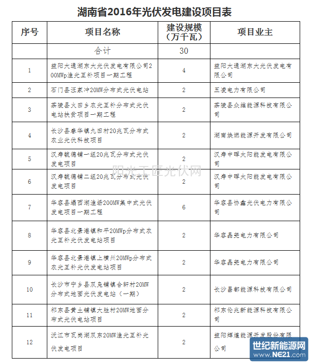 光伏电站建设规模30万千瓦(不包括屋顶光伏和光伏扶贫)。按照优先已开工项目、优先前期工作完善且近两个月内开工的项目、优先资源相对富集地区的项目、优先有业绩且积极性高的企业的项目、优先结合农业或渔业开发的项目等筛选原则,拟将益阳大通湖东大光伏发电有限公司200MWp渔光互补项目一期工程等12个光伏发电项目、装机30万千瓦(具体项目见附表)纳入2016年湖南省光伏发电建设实施方案。