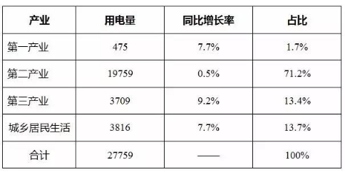 1全国总用电量情况:2016年上半年,全国全社会用电量27759亿kWh,同比增长2.7%。各产业的用电量分布情况如下表所示。
