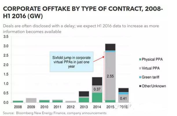 •实际购电协议的增长一直无法跟上可再生能源项目的增长速度,但企业购电协议曾在2015年为整体承购市场贡献了超过40%的购电合同,维持了市场的稳定。