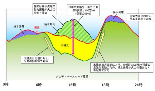 九州电力公开了2016年5月4日的供需平衡情况,下午一点光伏和风力的输出功率为490万kW,达到需求的66%。九州电力在抑制自家火力电源的同时,通过抽蓄发电的动力运转(抽水)保持了供需平衡。从公开的图表判断,九州电力的抽水动力(约219万kW)几乎是满负荷运转,可见自家设施的应对已近极限。