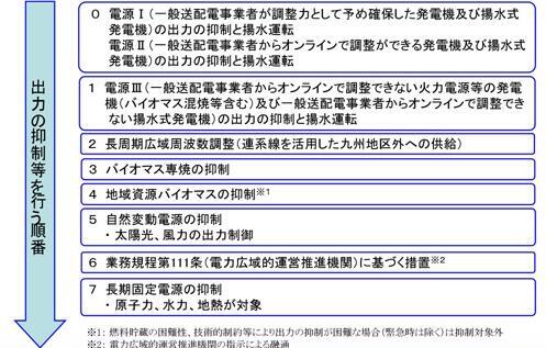 输出抑制次序为:在九州电力的火力电源停止或抑制后,(1)九州电力以外的火力电源、(2)利用并网线向九州以外地区的供电、(3)生物质专烧发电、(4)地放资源生物质发电、(5)自然变化电源(太阳能、风力)、(6)电力广域运营推进机构的措施、(7)长期固定电源(核电、水力、地热)。
