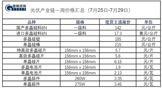 本周组件价格整体窄幅波动,市场有价无市,报价混乱,目前组件库存积压最为明显,部分一线企业库存已超2个月以上,而二线企业虽然一直维持低价出货套现,没有太多库存,但是订单还是不足。现货订单遇冷,更多企业参与了下半年电站项目招投标,根据盖锡调查了解,近期中广项目集中采购招投标开标结果中,组件最低企业报价至3.167元/瓦,最高在3.68元/瓦,参与的26家企业中平均组件报价在3.42元/瓦。