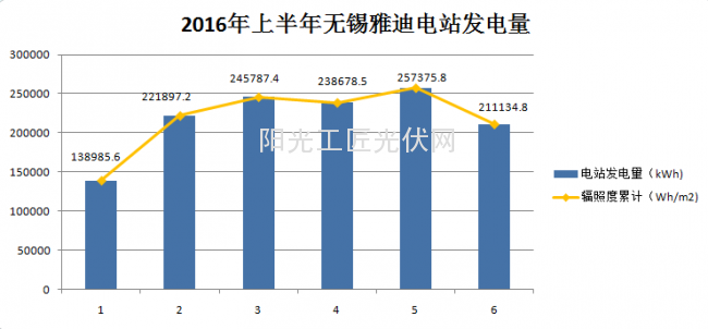 根据图中数据可以看出,雅迪发电站的月平均发电量为21.89万度电,由于1月正值冬季,而6月则是梅雨季,所以相比于其他几个月份发电量有明显减少。