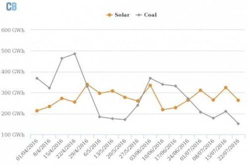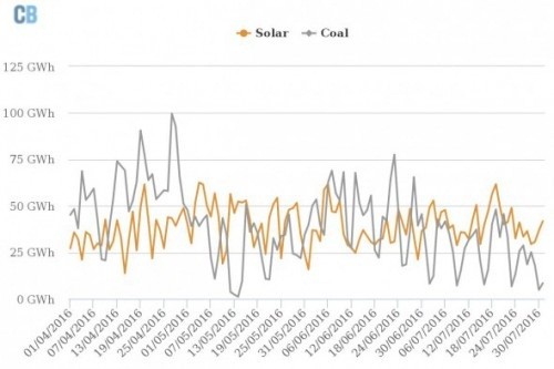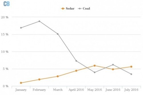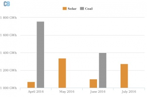 以下图表展示出:2016年5月太阳能发电量比煤炭发电量高出50%,7月高出64%。这个结果要归功于煤炭发电量的降低与日照时间的增加。
