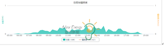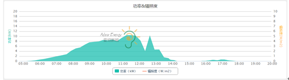 上图这样起起落落的曲线,说明今天是个多云的天气,当一大片云朵飘过来挡住太阳,系统功率也会因此有所降低,这就是光伏发电不是那么稳定的原因。