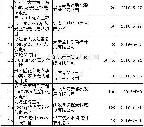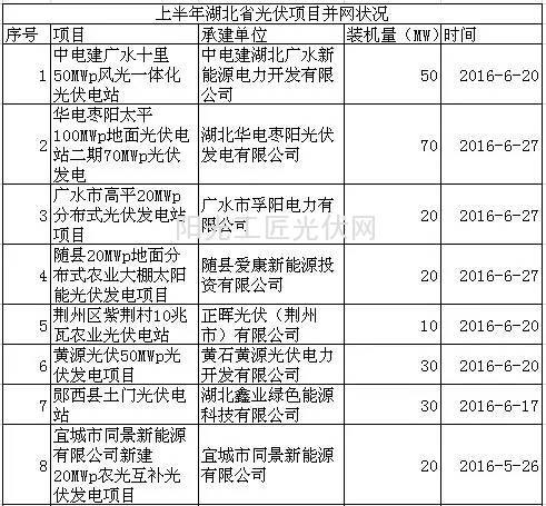 2016年上半年湖北省光伏项目并网情况如下: