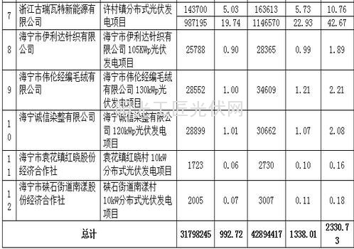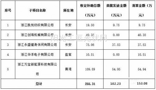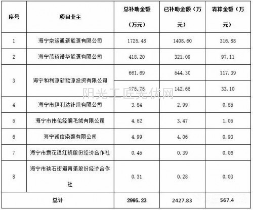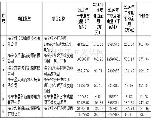 据悉,海宁市2014年度分布式光伏发电项目清算资金(2015年度第二批)720.48万元及电价补助(2016年1-2季度)2330.73万元,共计3051.21万元。其中:8户光伏发电企业电价补助清算资金567.40万元(详见附件1);5户屋顶企业补助清算资金153.08万元(详见附件2);12户项目业主单位一季度电价补助资金992.72万元、二季度电价补助资金1338.01万元(详见附件3)。该名单将公示7个工作日。有异议的,可以向海宁财政局企业科反馈。联系人:张晔联系电话:0573-87292023。