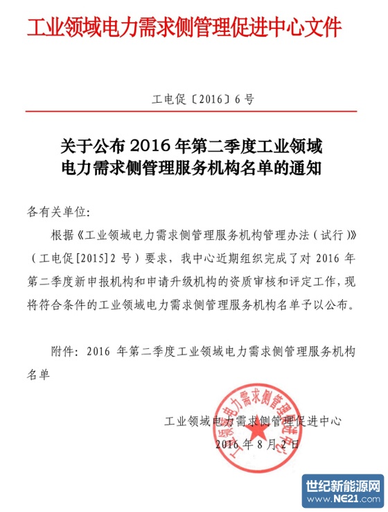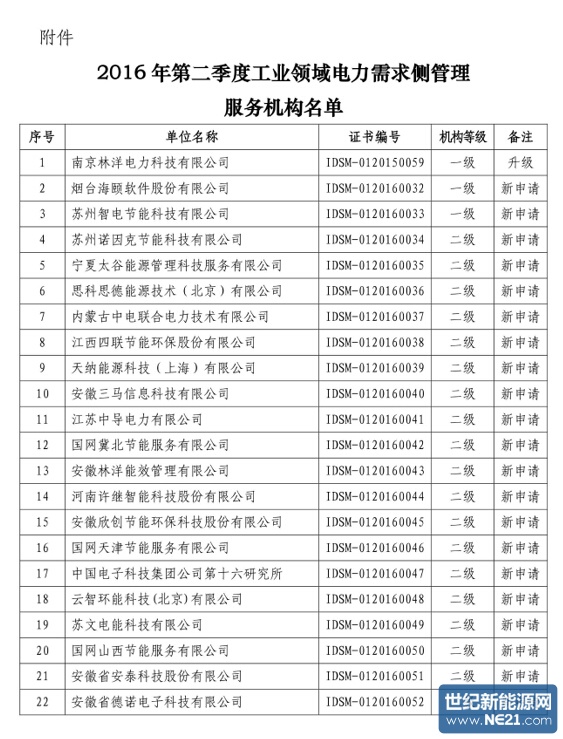 根据《工业领域电力需求侧管理服务机构管理办法(试行)》要求,工业领域电力需求侧管理促进中心对新申报机构和申请升级机构按季度公布名单。二季度公布的22家工业领域电力需求侧管理服务机构名单中,除1家一级机构为升级机构,其余2家一级机构和19家二级机构均为新申请机构。