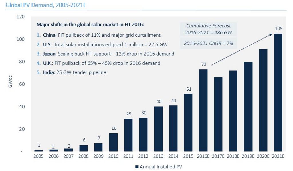 索比光伏网讯:根据GTM最新发布的太阳能需求监测报告来看,2016年,全球新增太阳能装机容量将比去年增长43%,达到73吉瓦。