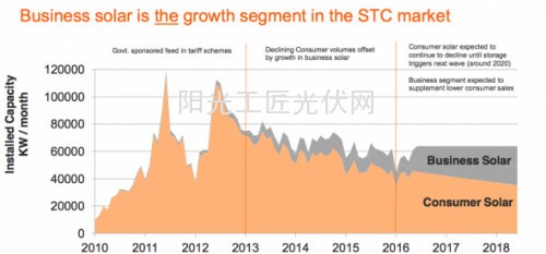 据相关消息称,商用太阳能在太阳能市场上已占30%,而2013年,这个数值仅为4%,根据预测,商用太阳能的市场份额还在持续增长。