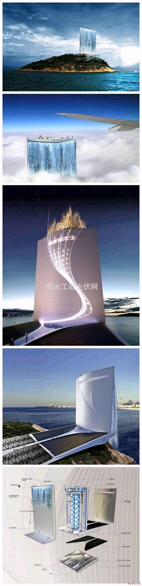这座象征巴西奥运新地标太阳能瀑布塔 (Solar CityTower) 的概念是来自于环保与自然,并融入巴西世界第一大瀑布伊瓜苏大瀑布的想象。这种建筑白天能藉由太阳能板吸收太阳光并发电,同时储存电力,提供晚上使用。