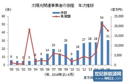 光伏相关运营商的倒闭数量年度走势(出处:东京商工研究)