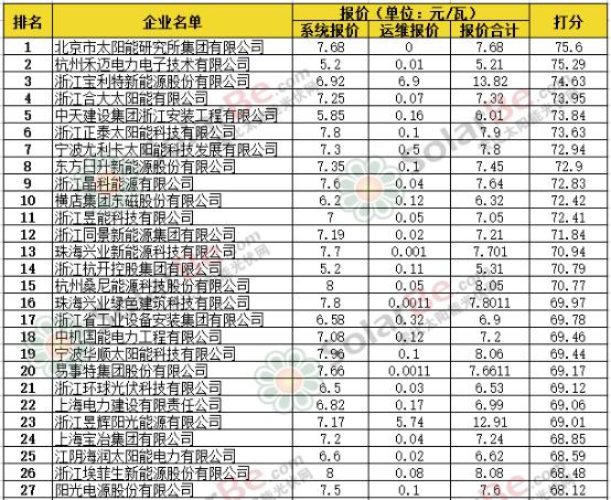该项目的企业系统报价平均约7.27元/瓦,运维报价约0.95元/瓦,合计报价平均在7.82元/瓦左右。采购中心给出的分数中,最高分是75.6分,最低分是38.9分。