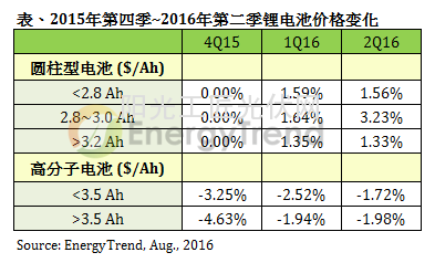 第二季方形电池在供需环境维持稳定下,价格波动已逐渐收敛,EnergyTrend预估2016下半年市场方形电池需求与供给呈现平衡状态,价格表现也将趋于稳定。