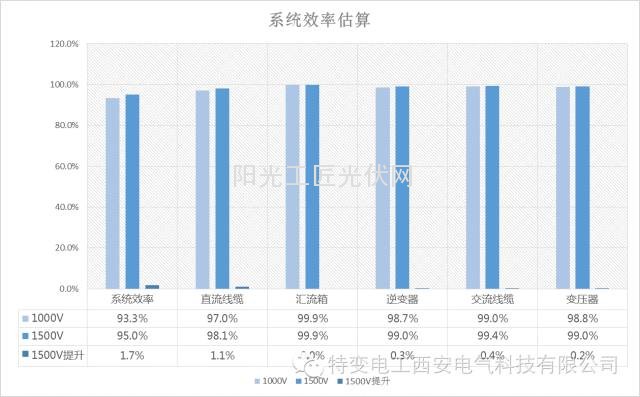 直流侧电压提升至1500V,交流侧电压提升至550V。系统交直流损耗、设备损耗下降30%,设备损耗降低10%。整体估算系统发电量至少提升1%~2%。