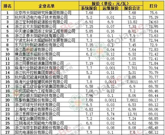 该项目的企业系统报价平均约7.27元/瓦,运维报价约0.95元/瓦,合计报价平均在7.82元/瓦左右。采购中心给出的分数中,最高分是75.6分,最低分是38.9分。