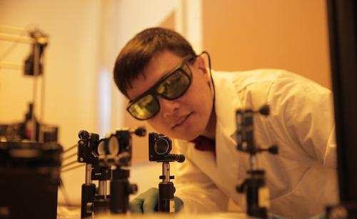Hongrui Jiang观察光源照亮新一代侧向太阳能电池的校准情形。他与研究小组开发的太阳能电池可从入射光采集较现有技术更多3倍的电量。