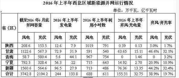 2016年上半年,西北五省(区)新增光伏发电并网容量178.7万千瓦,截至6月底,累计并网容量2194.2万千瓦,占全网总装机的11.0%。上半年,光伏发电量133.8亿千瓦时,占全网总发电量的4.5%;利用小时数611小时,弃光电量32.8亿千瓦时,弃光率19.7%。西北五省(区)中,新疆、甘肃光伏发电运行较为困难,弃光率为32.4%和32.1%。此外,宁夏弃光率10.9%,青海弃光率3.2%,陕西首次发生弃光限电情况,弃光率为1.7%。