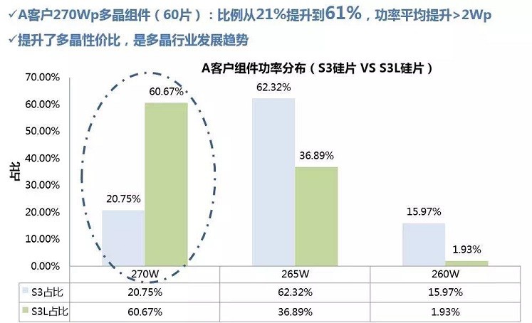第一、对多晶硅片的尺寸进行标准化,统一固定在跟单晶一样的标准尺寸156.75。图一是保利协鑫某一电池客户A将硅片由S3升级为S3L之后,组件的效率分布。可以看出,270Wp的组件分布由21%升至61%,平均效率提升大于2Wp。