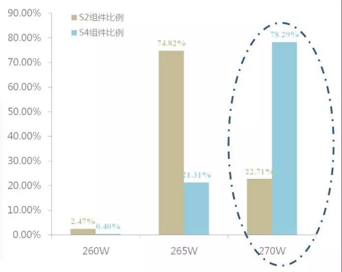 图二是B客户将多晶硅片由S2升级为S4之后,270Wp多晶组件的比例由23%提升至78%。