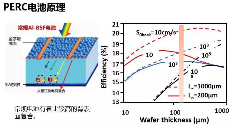 在现在的硅片厚度下,降低背表面复合速率可以显著提升效率。对于扩散长度更长的单晶来说,提升的效率更为显著。在P型单晶硅上PERC可以实现1%的效率提升,多晶硅上可以实现0.6%的效率提升。