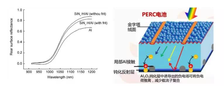 PERC技术采用Al2O3膜对背表面进行钝化,可以有效的降低背表面复合,提高开路电压,增加背表面反射,提高短路电流,从而提高电池效率。