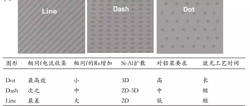 PERC电池目前提升效率的方向是优化开孔图形和体电阻率。理论上,dot 是最佳的,在相同的收集效果下,其合金接触面积是最少的,因而可达到更高的Voc和Isc.但是dot 对于Al浆的要求高,形成空洞的可能性高。Dash的空洞介于line和dot 之间,对Al的要求相对低一些,更容易实现。