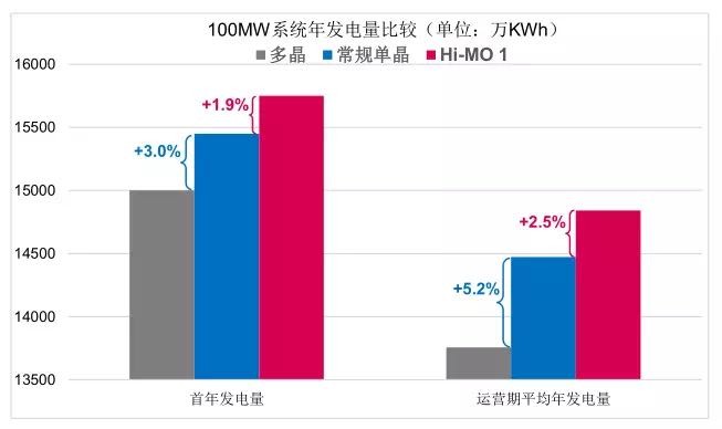 经测算,采用低光衰的高效单晶PERC组件,年平均发电量较多晶和常规单晶高5.2%和2.5%。