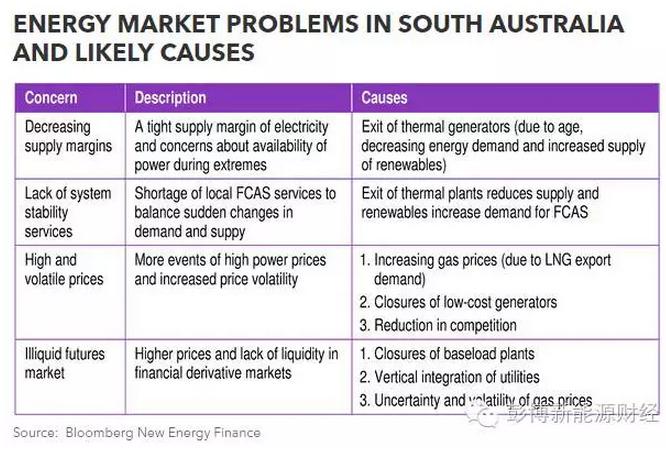 澳大利亚南部的电力市场主要面临4个问题:电力供应利润降低、系统稳定性服务缺乏、批发电价高位波动,以及期货市场流动性不足。