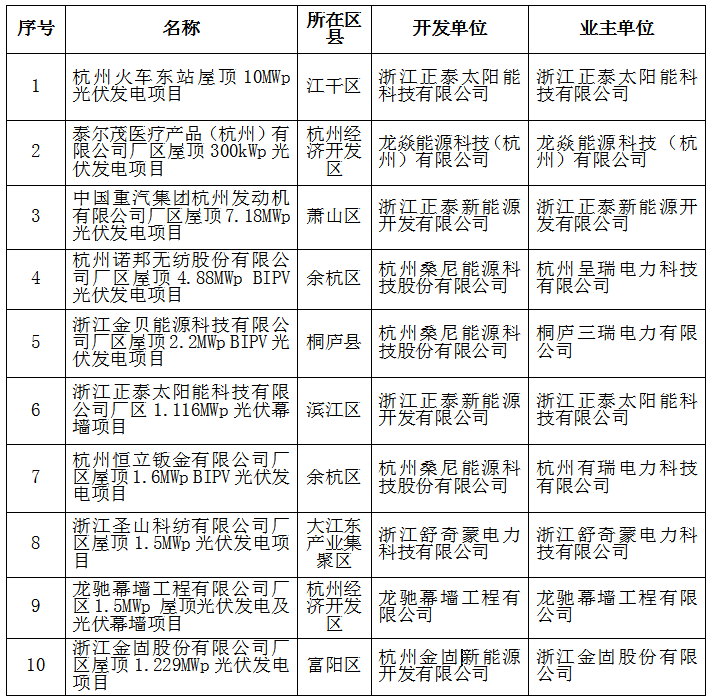 索比光伏网讯:日前,杭州经信委公布了分布式光伏发电示范项目名单,共10家企业上榜。