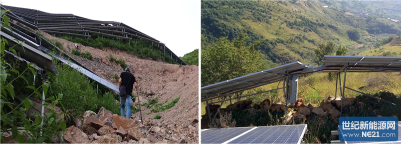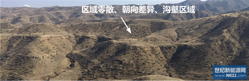 利用地形零散、朝向各异的山地、丘陵等资源开发的光伏电站。该类电站受地形影响,多有组件朝向不一致或早晚遮挡问题,地形零散,组件集中布局困难。