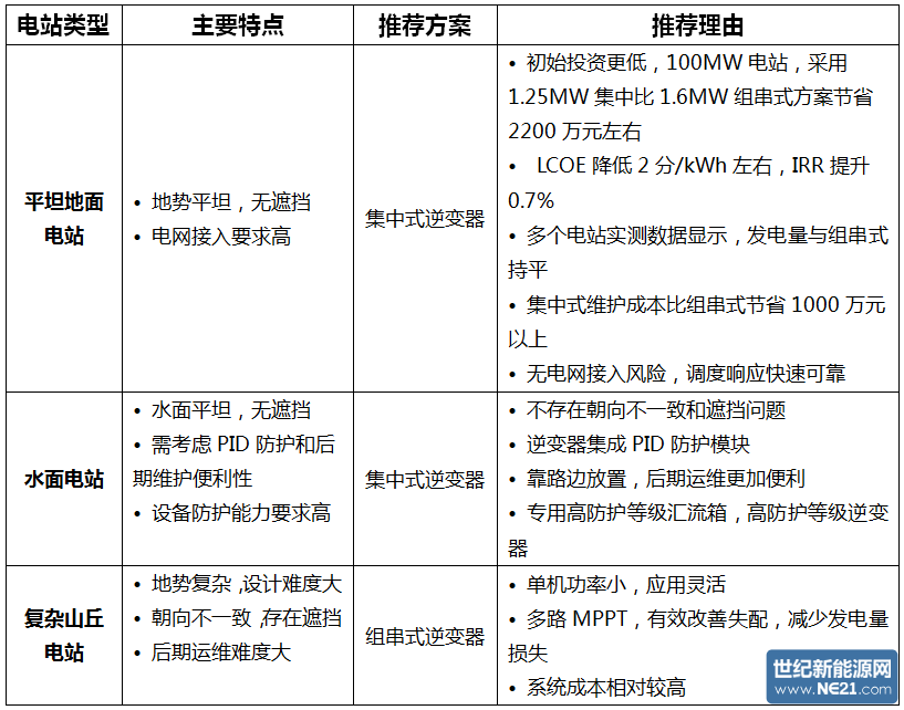 根据平坦地面电站、水面电站、复杂山丘电站安装环境特点,根据“因地制宜,科学设计”的逆变器选型理念,给出不同电站的推荐方案如表2所示。