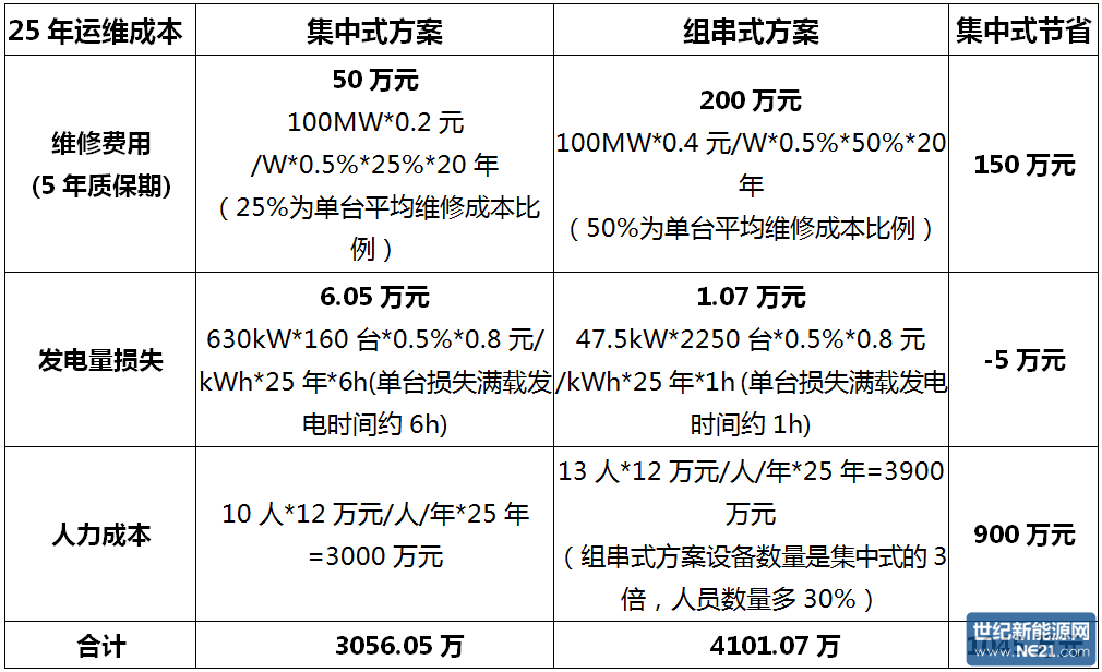 表4 集中式和组串式运维费用对比(100MW电站,假设0.5%的逆变器故障率计算)